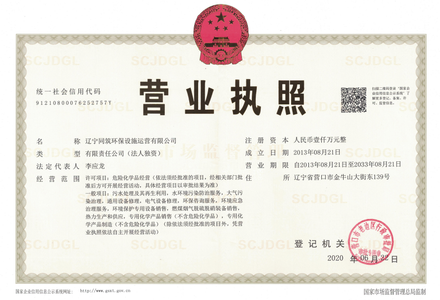 辽宁同筑环保设施运营有限公司成立于2013年,是一家专业的第三方环保设施运营公司,依托于集团各公司营口市环境工程开发有限公司、辽宁聚实环保科技有限公司、辽宁筑海检测科技有限公司在可研、环评、设计、施工、监理、在线检测、第三方检测等支持下开展环保设施运营工作。公司先后获得了由辽宁省环保产业协会颁发的污染治理设施运行服务能力评价证书。建筑业企业资质证书(环保工程专业承包三级),及ISO9001质量管理体系、IOS14001环境管理体系、ISO18001职业健康安全管理体系认证和辽宁省A级信用等级证书、安全生产标准化、危险化学品经营许可证。公司现有在职职工168人,专业技术人员50人。累计运营项目150余项,先后服务于冶金、供暖、热电联产、火电等行业及医疗、屠宰、造纸、石化、印染、食品、城镇生活污水等行业。