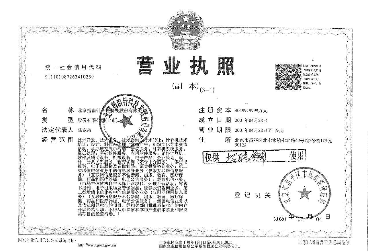 指南针是中国证监会批准的证券投资咨询机构(许可证编号:012000),也是北京市科学技术委员会、北京市财政局、北京市国家税务局、北京市地方税务局联合认定的国家高新技术企业。公司总部座落于中关村北部核心区——TBD云集中心,目前在全国拥有两大运营中心——北京TBD运营中心以及广东智富运营中心,拥有在册员工1500余人。
