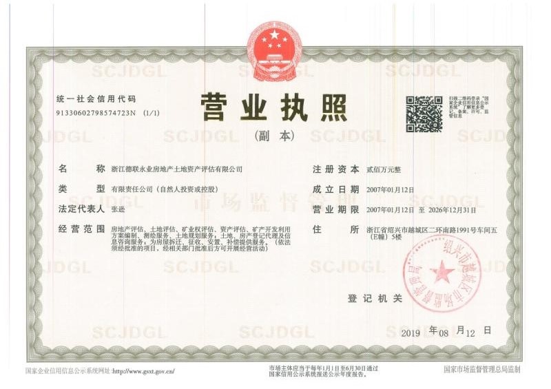 浙江德联永业房地产土地资产评估有限公司成立于2007年,注册资本200万元,注册及办公地址为绍兴市越城区二环南路1991号E幢5楼。经营范围包括房地产评估、土地评估、矿业权评估、资产评估、矿产开发利用方案编制、测绘服务、土地规划服务;土地、房产登记代理及信息咨询服务;为房屋拆迁、征收、安置、补偿提供服务。