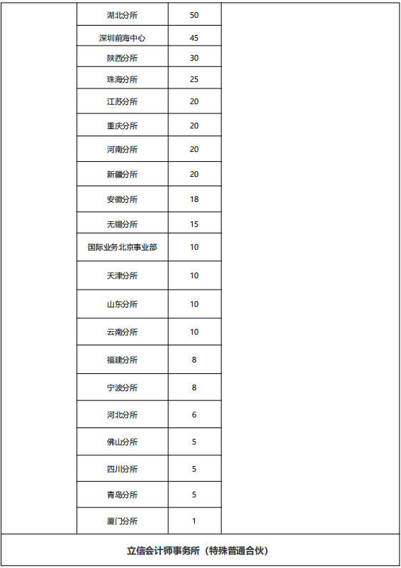 深圳分所现有员工近1000人,执业注册会计师200余人,信息系统审计鉴证师6人,税务师40余人,资产评估师10余人,具有ACCA、AIA、ACA、ASCPA等海外主流资质人员近20人。