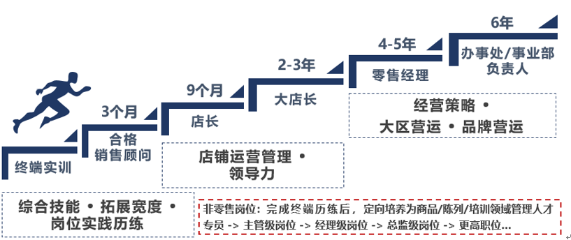 l 三年内零售终端基层培养,包含:销售精英→店长→大店长(零售主管);