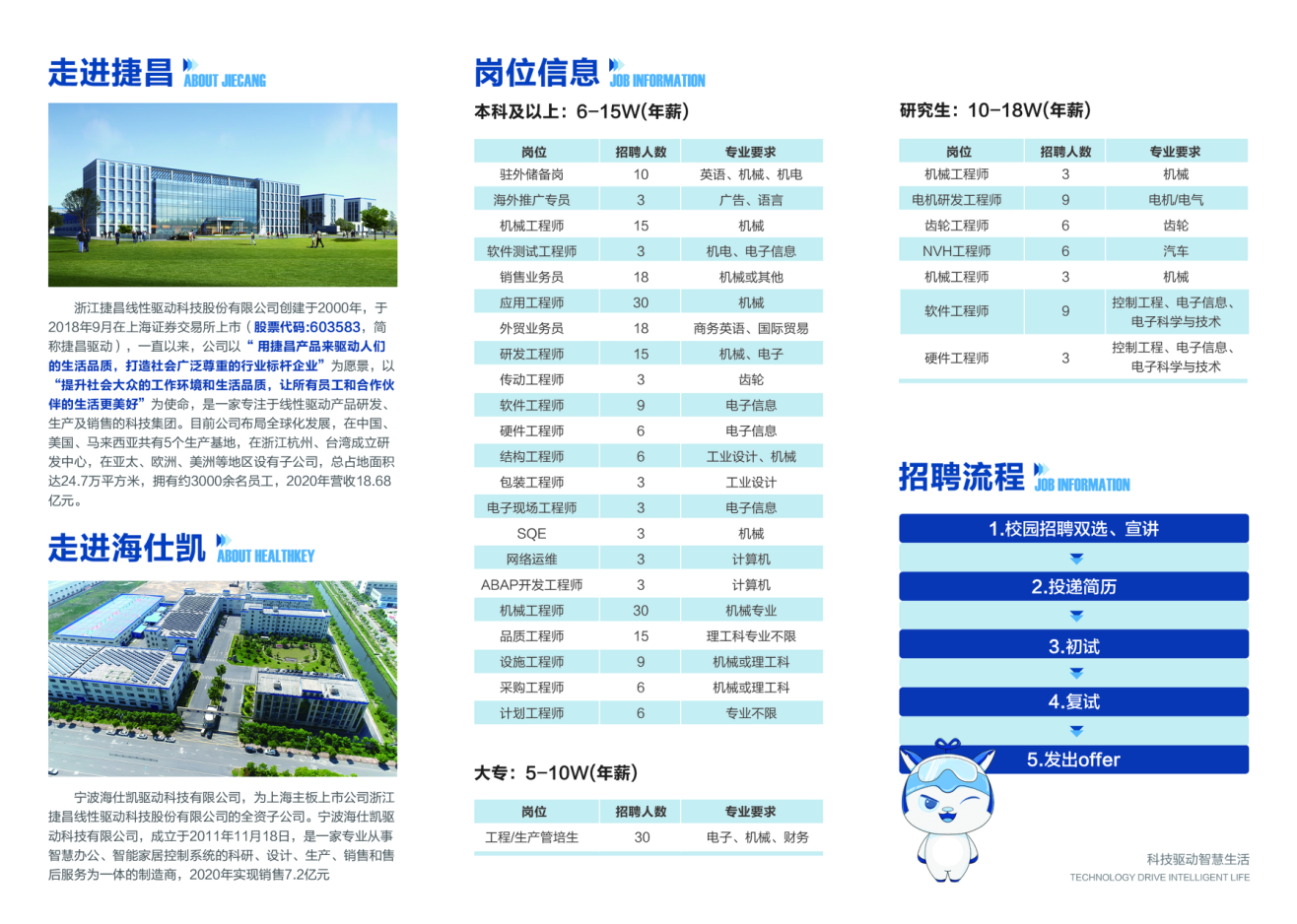 浙江捷昌线性驱动科技股份有限公司创建于2000年,并于2018年9月在上海证券交易所上市(股票代码603583,简称捷昌驱动),是一家专注于线性驱动产品研发、生产及销售的科技集团。目前公司布局全球化发展,在国内拥有浙江新昌、浙江慈溪两大生产基地,先后在浙江杭州、台湾成立研发中心,在亚太、欧洲、美洲等地区设有子公司和生产基地,总占地面积达24.7万平方米,拥有约2000名员工,2019年营收超14亿元。公司网址:www,jiecang.com 捷昌是国家高新技术企业,牵头起草了中国《直流电动推杆》行业标准、《电动升降桌》行业标准,填补行业标准空白,推动行业的标准化和产业化进程。 公司整合全球资源,为智慧办公、医疗康护、智能家居、工业自动化等关联产业提供驱动及智能控制解决方案,以科技驱动智慧生活