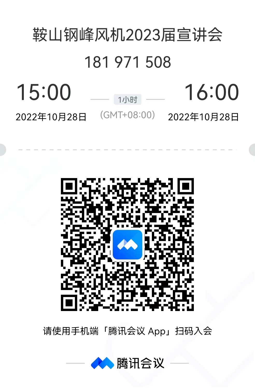 公司开展空中宣讲会,请提前下载好腾讯会议APP102815:00-16:00,会议号181971508欢迎按时参会!