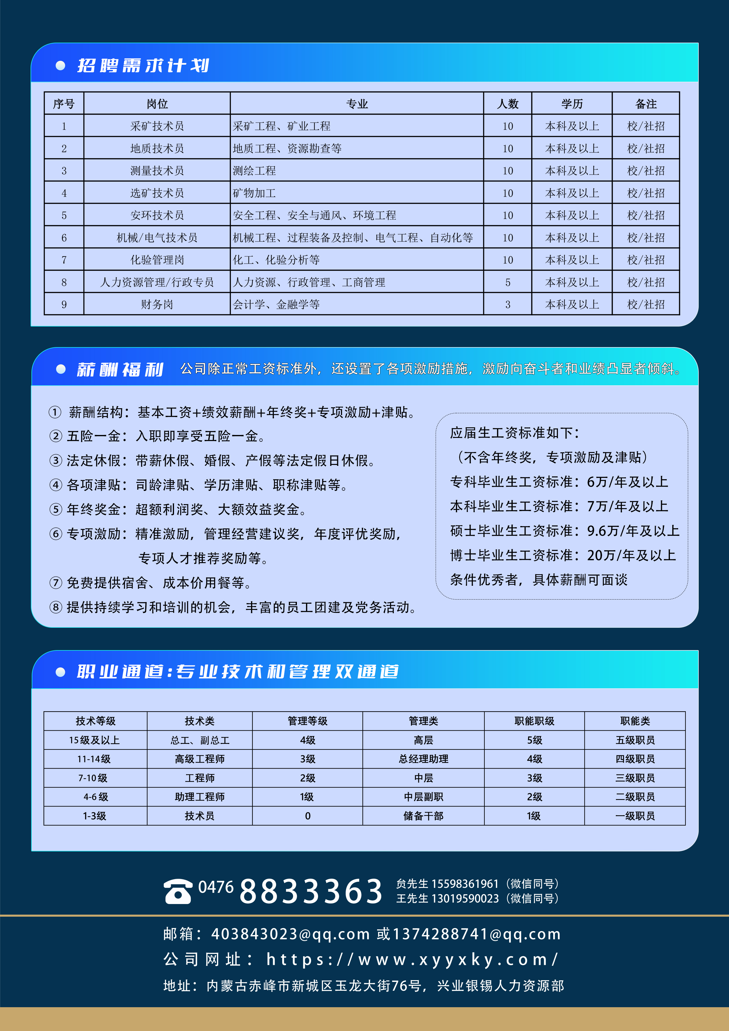 公司历经多年的创新发展,积累了丰富的矿山建设和有色金属采选生产经验,在人才、管理、技术和设备等方面具有较强的市场竞争能力,业已构成集地质、采选、冶炼于一体的产业链。公司致力于打造担当务实、专业化的人才队伍,竭诚邀请各位专业人才加入兴业团队,您将是我们人才梯队建设的一员,与公司共谋发展。
