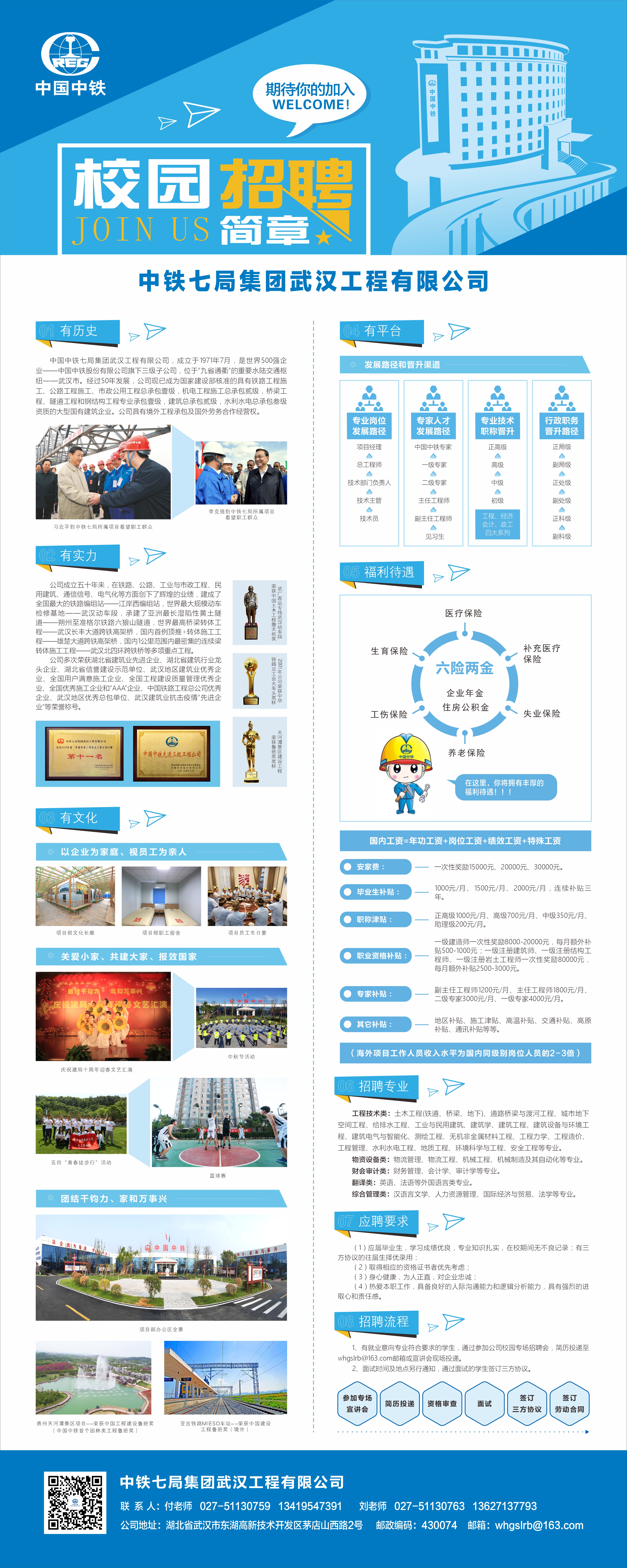 中国中铁七局集团武汉工程有限公司,成立于1971年7月,是世界500强企业——中国中铁股份有限公司旗下三级子公司,位于“九省通衢”的重要水陆交通枢纽——武汉市。经过50年发展,公司现已成为国家建设部核准的具有铁路工程施工、公路工程施工、市政公用工程总承包壹级,机电工程施工总承包贰级,桥梁工程、隧道工程和钢结构工程专业承包壹级,建筑总承包贰级,水利水电总承包叁级资质的大型国有建筑企业。公司具有境外工程承包及国外劳务合作经营权。