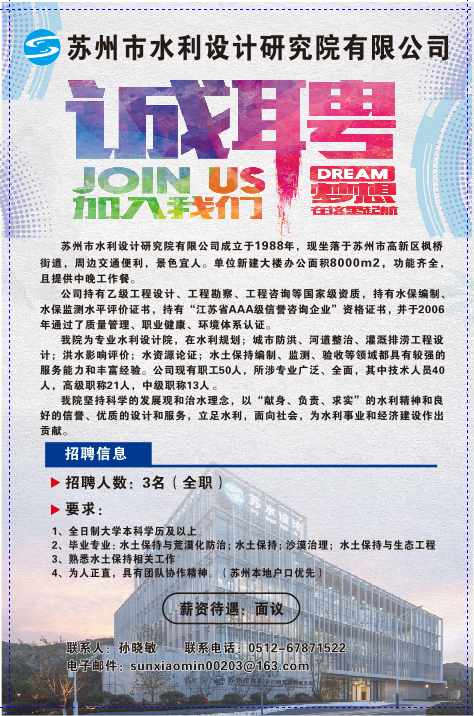 苏州市水利设计研究院有限公司成立于1988年,现坐落于苏州市高新区枫桥街道,周边交通便利,景色宜人。单位新建大楼办公面积8000m2,功能齐全,且提供中晚工作餐。