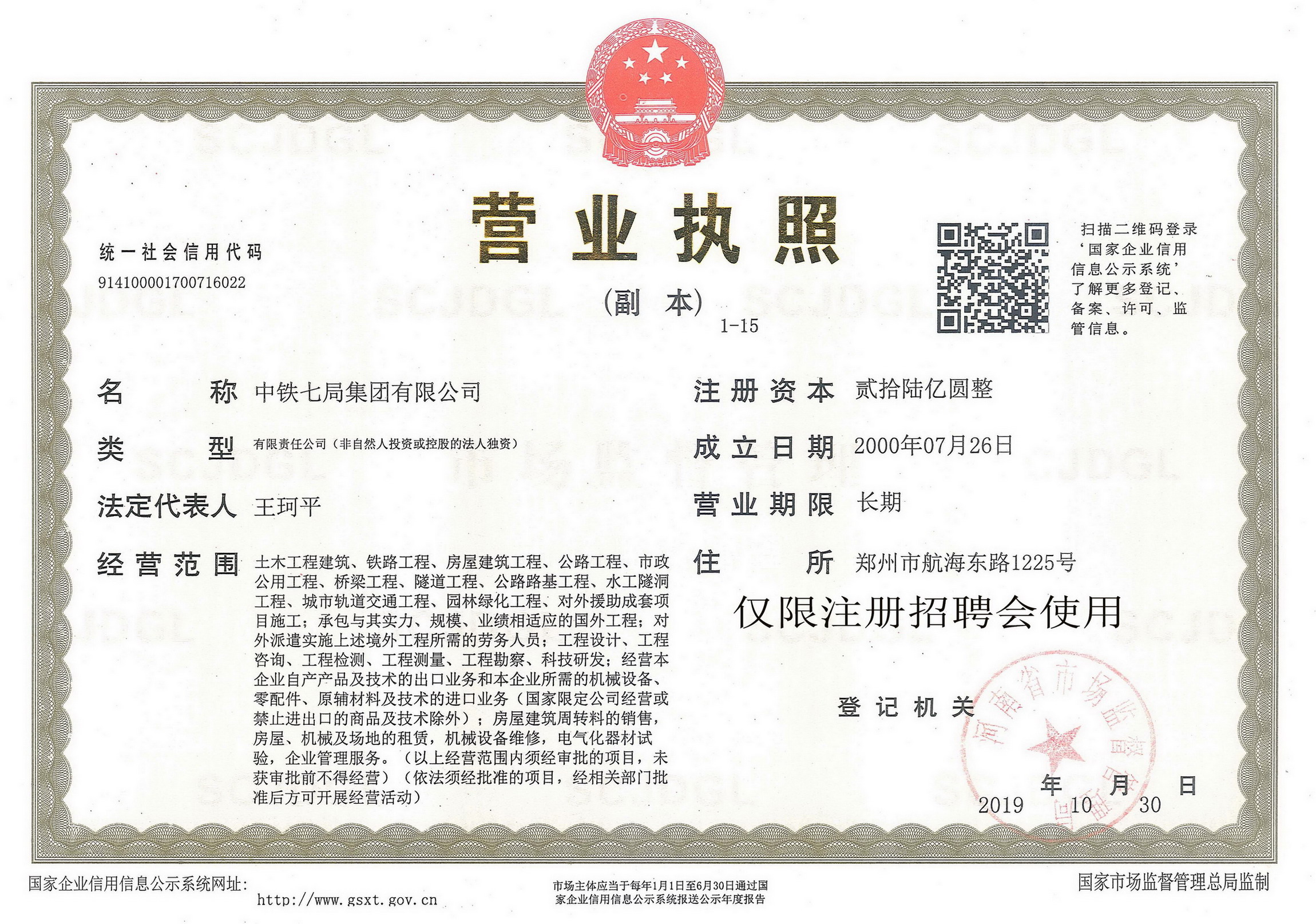 中铁七局集团有限公司是世界500强企业——中国中铁旗下骨干企业,成立于2003年12月25日,注册地在河南省郑州市。企业现有员工1.6万余人,下辖12个全资子公司、2个分公司、1个国家级企业技术中心,主要分布在河南、湖北、陕西、辽宁等地区。